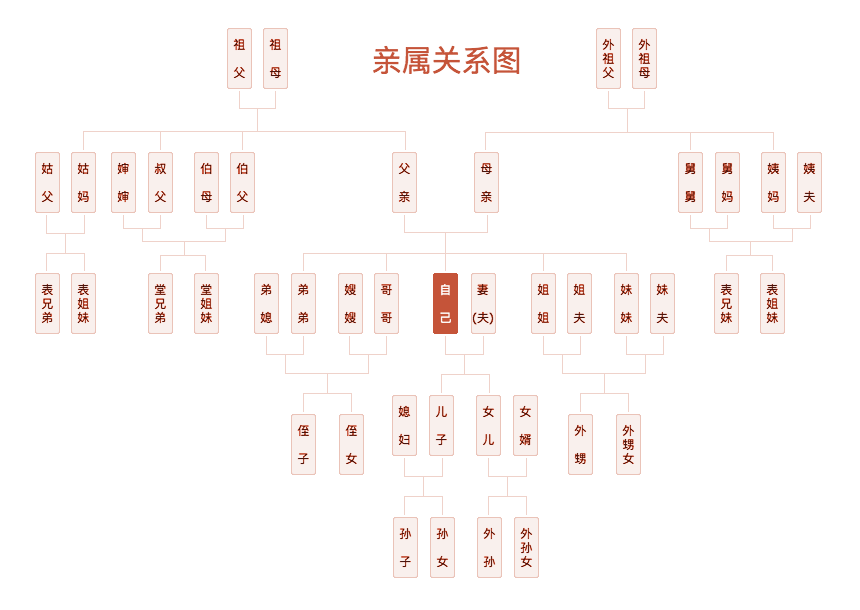 - 表兄弟姊妹 - 父系血親的長(cháng)輩(姑)的兒子或女兒和母系血親的長(cháng)輩(舅、妗、姨)的兒子或女兒