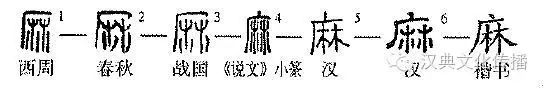 同?!对?shī)·齊風(fēng)·南山》:“蓺麻如之何?衡從其畝。”(“蓺”即“藝”,今簡(jiǎn)化為“藝”,種植)引申指麻的莖皮纖維。又引申有用麻布制成的喪服、麻布帶子、不光滑等意義。“麻"字本從“廠(chǎng)”,從小篆開(kāi)始變?yōu)閺?ldquo;廣(yan3)”。所以《說(shuō)文》釋為:“人所治,在屋下。從廣,從