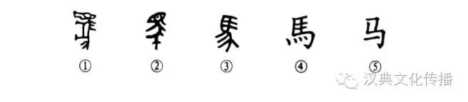 杜甫說(shuō):“射人先射馬?!边@個(gè)“馬”字是個(gè)象形字。甲骨文①是頭朝上,背朝右,尾朝下的一匹馬。金文②的形體也與甲骨文大致相似,頸上的鬃毛鬣鬣可見(jiàn),小篆③的形體則與金文非常接近,不過(guò)不太像馬形了。④為楷書(shū)的形體,根本沒(méi)有馬的樣子。因為這個(gè)字筆畫(huà)較繁,所以就產(chǎn)生了簡(jiǎn)化字⑤的形體,僅有三畫(huà),書(shū)寫(xiě)方便。