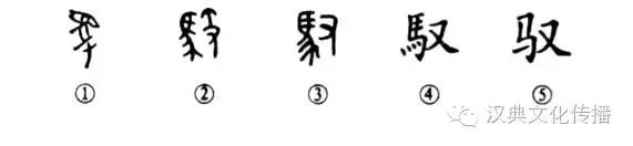 這是“駕馭”的“馭”字,是個(gè)會(huì )意字。甲骨文①上部是一匹頭朝上的馬,下部是一只手,是用手駕馭馬的意思。金文②的結構位置有所變化,其左是馬,其右是手拿馬鞭之形,也是馭馬之意。③是小篆的形體,左為馬,右為手.是由甲骨文演變而來(lái),因為其右是手,而并非手執鞭形,是以手馭馬之意。④是楷書(shū)的形體,是由小篆直接演變而來(lái)的。⑤是簡(jiǎn)化字。