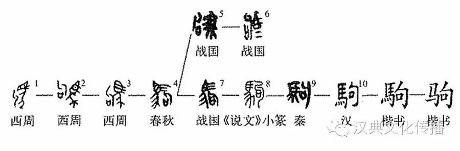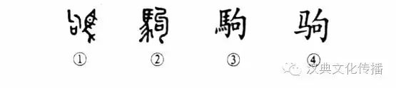 這是“白駒過(guò)隙”的“駒”字,本為形聲字。①是金文的形體。左邊是“句”,表聲;右邊是“馬”,表形。②是小篆的形體,“馬”移于左邊,其義不變。③是楷書(shū)繁體字。④為簡(jiǎn)化字。