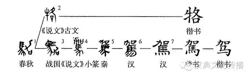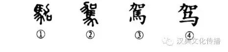 這是“駕輕就熟”的“駕”字,本為形聲字。①是石鼓文的形體,其左為“馬”,表形;其右為“加”,表聲。②是小篆的寫(xiě)法,“加”移于“馬”上,其義不變。③是楷書(shū)繁體字。④為簡(jiǎn)化字。《說(shuō)文》:“駕,馬在軛中。從馬加聲。”“駕”字的本義就是把車(chē)套在馬身上,如《詩(shī)經(jīng)·小雅·采薇》:“戎車(chē)既駕,四牡業(yè)業(yè)(強健的樣子)?!?/span>