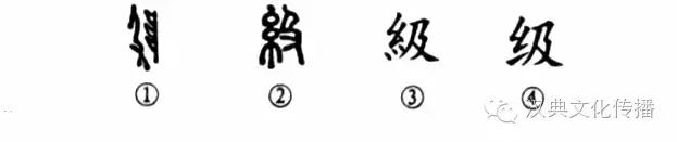 “蔑彼名級?!边@個(gè)“級”字本為會(huì )意兼形聲的字。①是甲骨文的形體,左邊是手捕捉了一個(gè)人的形象,即為“及”字,既表意也表該字的讀音,右邊是“阜”,表示山阜有層次,也有“臺階”之意。于省吾先生認為該形體是“級”字的初文。②是小篆的形體,將“及”移到了右邊,“阜”又變?yōu)椤棒椤?。③為楷?shū)繁體字。④為簡(jiǎn)化字。
