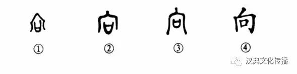 這是“眾葩敷榮向春風(fēng)”的“向”字,本為象形字。甲骨文①就像一座房子,在墻壁上開(kāi)了一個(gè)窗子。金文②和小篆③都同于甲骨文。④是楷書(shū)的形體,已經(jīng)看不出房子的墻壁上有窗戶(hù)的形象了。