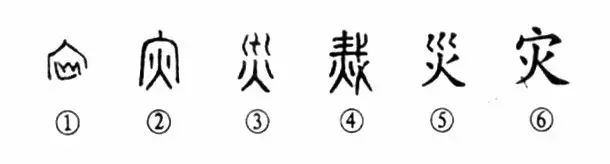 “災異數見(jiàn),不可不憂(yōu)?!边@個(gè)“災”字本為會(huì )意字。甲骨文①的外部是房屋之形,內部是“火”,火焚房屋為“災”。②是《說(shuō)文》中的或體字,實(shí)際就是從甲骨文演變而來(lái),本為正體,《說(shuō)文》卻誤為或體。③是“災”字的籀文形體,上部的“川”字中間有一橫,表示川被堵塞就要決口成災,下部又有“火”,水火無(wú)情,當然更是災害之意。④為小篆的形體,變成一個(gè)形聲字了(“火”為形,其余的部分為聲)。⑤是楷書(shū)體,是由籀文演變而來(lái),成為后世的書(shū)寫(xiě)正體了。⑥為當今的簡(jiǎn)化字,實(shí)際上是甲骨文形體的借用,仍表示火燒房屋,是會(huì )意字。