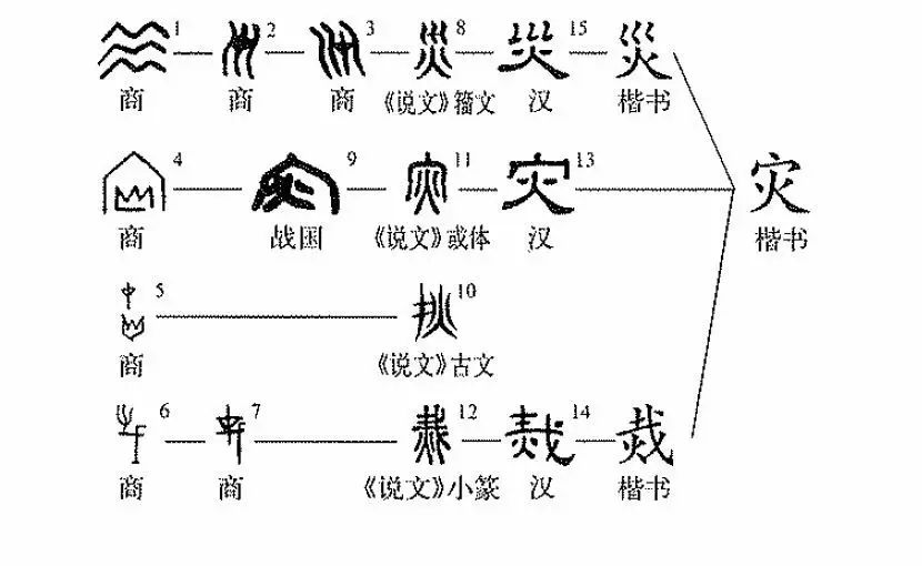 ,從戈、才聲),或書(shū)“戈”上“十”字即“才”之省變?,F代漢字整理時(shí),將“烖”“災”(從水、火會(huì )意)作為“災”的異體字淘汰。(郭小武、葉青)