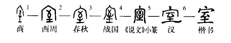 音兼形聲字。從宀,從至,至也表音。《說(shuō)文》:“室,實(shí)也。從宀,從至。至,所止也。”徐鍇系傳:“室,實(shí)也。從宀,至聲。室、屋皆從至,所止也?!北玖x是居室、房間。唐玄應《一切經(jīng)音義》卷六:“戶(hù)外為堂,戶(hù)內為室。”《論語(yǔ)·先進(jìn)》:“由也,升堂矣,未入于室也。”引申有房屋、家人、家產(chǎn)、妻子、朝廷、墳墓和刀劍的鞘等意義。(張玉金)
