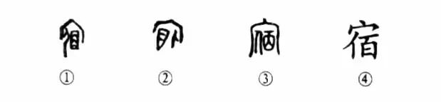 這是“夜宿荒灘頭”的“宿”字.是一個(gè)會(huì )意字,很像一幅畫(huà)。你看甲骨文①的外面就是一座房屋的形象,屋內的右邊是一條席子,席子的上面仰面躺著(zhù)一個(gè)人,這是表示住宿的意思。金文②的各組成部分同于甲骨文,只是席子變成了三角形,“人”與“席子”調換了一下位置,但意思沒(méi)有變。小篆③的“席子”變成了“百”,沒(méi)有象形的樣子了。④是楷書(shū)的形體,它是直接由小篆變來(lái)的。