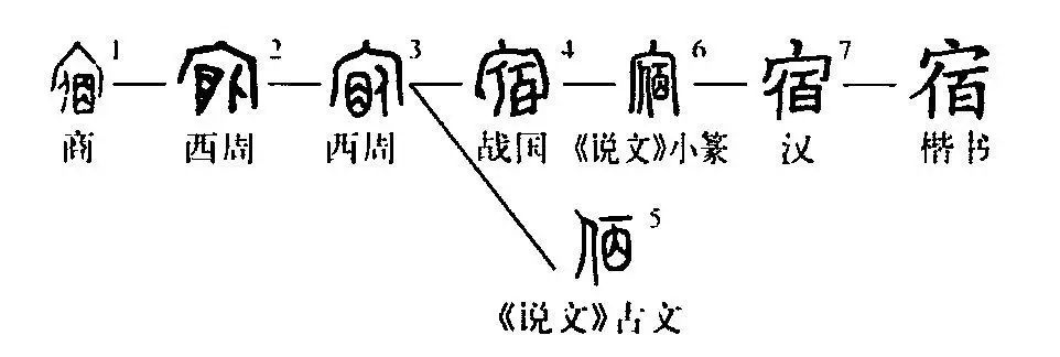 ”,進(jìn)而變?yōu)椤鞍佟?,與“百”(bǎi)同形了。本義就是夜晚睡覺(jué)。《說(shuō)文》:“宿,止也。”《玉篇·宀部》:“夜止也。”《詩(shī)·衛風(fēng)·考槃》:“獨寐寤宿?!币暧芯幼?、住宿的地方、夜等等意義。又引申為量詞,指一夜,這時(shí)讀為xiǔ。又指天上的星辰,這時(shí)讀xiù。字可通假為“肅”為“縮”。(張玉金)