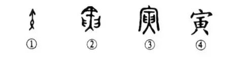 這是“寅吃卯糧”的“寅”字,本為象形字。①是甲骨文的形體,就像一枝箭(矢)形。②是金文的形體,“矢”變得復雜了一些,左右為兩只手,表示用雙手奉矢之形。③是小篆的形體,箭頭訛變成“宀”,完全失去了雙手奉矢之形了。④為楷書(shū)的寫(xiě)法。