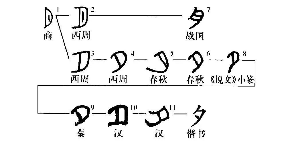 ”,像月出之形。金文多作“夕”?!跋Α迸c“月”本為一字,后來(lái)才分化為兩字。《說(shuō)文》:“夕,莫也。從月半見(jiàn)。”所以“夕”的造字本義就是“暮夜”之意。甲骨文:“戊戌卜,永貞:今日其夕風(fēng)?”(《合集》13338)又:“貞,今夕其雨疾。”(《合集》12670)也引申為動(dòng)詞,指夜晚祭月。《國語(yǔ)·周語(yǔ)上》:“于是乎有朝日、夕月,以教民事君。”韋昭注:“禮:天子以春分朝日,以秋分夕月。拜日于東門(mén)之外,然則夕月在西門(mén)之外必矣。”后泛指時(shí)間。《詩(shī)·小雅·白駒》:“縶之維之,以永今夕。”毛傳:“夕猶朝也。”也假借為“汐”。《荀子·禮論》·“月夕卜宅。”楊倞注:“月夕,月末也。”還假借為“昔”等。(王志平)