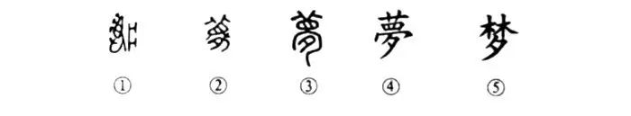 這是“夢(mèng)筆生花”的“夢(mèng)”字,本為會(huì )意兼形聲字。①是甲骨文的形體,右邊是一張床形,左邊是一個(gè)人躺在床上,手撫額頭在做夢(mèng)。這個(gè)突出眼眉的人形也表聲。②是楚帛書(shū)文字的形體,基本上失去了原形。下部增加了“夕”,表示夜晚做夢(mèng)。③是小篆的形體。④為楷書(shū)繁體字的寫(xiě)法。⑤為簡(jiǎn)化字。