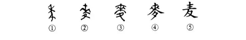 這是個(gè)“麥”字。從甲骨文①的形體看,其上部是一棵小麥形,麥穗朝左,麥下就是一只腳趾朝下的腳(倒“止”)。凡是腳都有“走”的意思,所以這個(gè)“麥”字本來(lái)就是“來(lái)去”之“來(lái)”的本字,而“來(lái)”倒是“麥”的本字??墒窃诓忿o中使用“麥”字較少,而使用“來(lái)”字極多,所以這就發(fā)生了互換現象。把原來(lái)當“小麥”講的“來(lái)”,變成了“來(lái)去”之“來(lái)”;把本來(lái)當“來(lái)去”講的“麥”,變成了“小麥”的“麥”。這一交換再也沒(méi)有還原過(guò)。金文②仍然是上為“麥”形,下為一只腳。小篆③也沒(méi)有大變,下部仍為腳形。④是楷書(shū)形體。⑤為簡(jiǎn)化字。