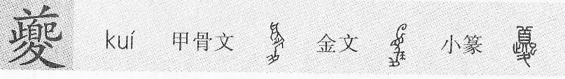甲骨文像有角、手、足和人面之形,用以表示山怪。金文與甲骨文相似。小篆發(fā)生了較大變化。《說(shuō)文》:“夔,神魖也。如龍,一足,從夕,象有角、手、人面之形。”“夔”的本義指“古代傳說(shuō)中的一種山怪”。