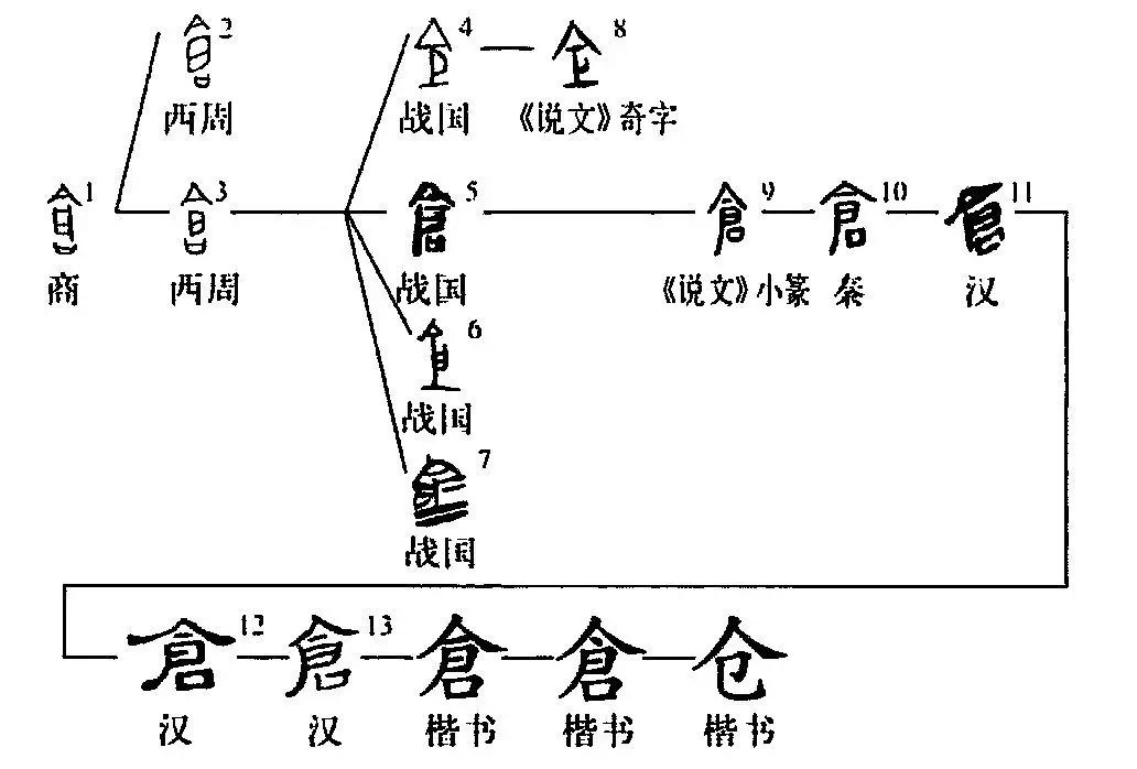”下的橫畫(huà)變成點(diǎn)。1956年《漢字簡(jiǎn)化方案》把“倉”字簡(jiǎn)化作“倉”,這與《說(shuō)文》“倉”下奇字及清代刊行的《目連記彈詞》等書(shū)中“倉”的寫(xiě)法相近。《說(shuō)文》:“倉,穀藏(zàng)也。”本義是糧倉。《詩(shī)·小雅·楚茨》:“我倉既盈。”比喻引申為船艙,后來(lái)寫(xiě)作“艙(艙)”。(金國泰)