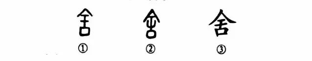 這是“客舍青青柳色新”的“舍”字。我們看金文①的上部就像屋頂(兩面坡),中間的“干”形部分就是頂柱與橫粱,下部“口”即為磚石砌的墻基。由此可見(jiàn),“舍”的本義就是房屋,亦稱(chēng)房舍。②是小篆形體,其它各部分均同于金文,僅“干”形的第二橫改為向上彎曲。這不僅美觀(guān),而且也很像廟宇中的斗拱,這樣的房屋是很結實(shí)的??瑫?shū)③的形體基本上同于金文。