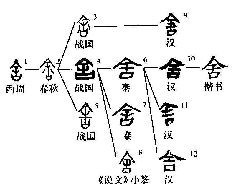 ”形而只有橫筆,作“舍”形者傳至楷書(shū)。不過(guò),在漢初至漢末,“舍”字聲符中的“干”形,也常常被寫(xiě)作“土、工、