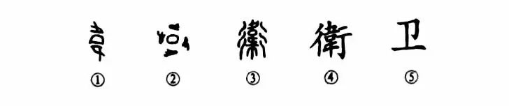 這是“保衛”的“衛”字的繁體字“衛”,是個(gè)會(huì )意字。甲骨文①的上部是腳趾朝左的一只腳,下部是腳趾朝右的一只腳,中間的“口”字形表示一個(gè)區域或者一個(gè)城市。那么腳步在其周?chē)?,就是“保衛”的意思。金文②的形體更為形象,中間的圓圈表示區域或城市,周?chē)乃闹荒_真像是哨兵或衛士所留下的足跡。這個(gè)金文的形體比甲骨文的形體繁雜了一些??墒堑搅诵∽鄹彪s了,其中間是沿用了甲骨文的形體,左右兩側增加了個(gè)“行”字,表示這個(gè)區域或城市四通八達。同時(shí),這個(gè)“衛”字從原來(lái)的會(huì )意字變成了外形(行)內聲(韋)的形聲字了。④是楷書(shū)的寫(xiě)法,直接由小篆演變而來(lái)。⑤是簡(jiǎn)化字。