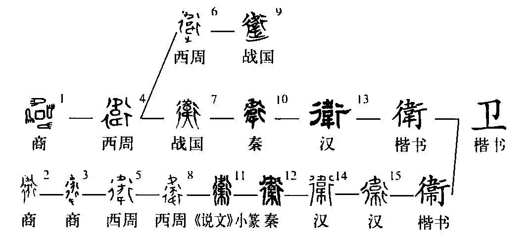 會(huì )意字。《說(shuō)文》作衞,“宿衞也,從韋、帀,從行。行,列衞也。”甲骨文從四足環(huán)繞著(zhù)城邑之形,商承祚《十二家吉金圖錄》:“羅叔蘊師謂眾足繞口,有守衛意。”甲骨文或省去兩邊之足而從行,或將表示城邑的“口”改成“方”等。金文或見(jiàn)下部復增“止”;或“方”變形作“