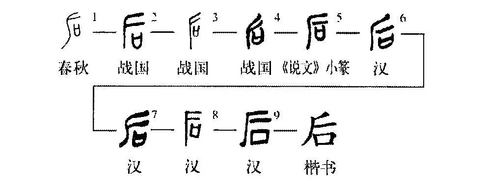 構形之義不明。《說(shuō)文》:“后,繼體君也。象人之形,施令以告四方,故廠(chǎng)之從一口,發(fā)號者君后也。”徐灝段注箋:“古者凡繼體從政有君人之道者皆曰后,故有后夔、后羿之稱(chēng),而諸侯謂之群后,天子獨稱(chēng)元后,后世乃為后妃之專(zhuān)名。顧氏炎武曰:帝嚳四妃、帝舜三妃,以至周初太姜、太任、太姒、邑姜皆無(wú)后名,《春秋桓八年》:‘祭公來(lái)遂逆王后于紀’,于是始稱(chēng)后。”以上許、徐之解后字結構,只可備一說(shuō)而已,皆無(wú)可信之證據。徐說(shuō)后字之用法可信。君后之后字形體不見(jiàn)于商代甲骨文,也不見(jiàn)于西周金文。甲骨文、西周金文皆以毓(育)字為后,甲骨文有毓祖丁,商代金文也有毓祖丁,用為君后、君王之義。西周金文班簋“毓文王”也是用為君王之義。甲骨文.西周金文“后”字習見(jiàn),但不是君后之后,而是司字的異體,古文字中形體反正無(wú)別,皆用為司、嗣等義,無(wú)一字用為君后、君王之義者。于省吾《壽縣蔡墓銅器銘文考釋》:“‘后’為‘毓’的后起字。西周金文仍以‘毓’為‘后’,班簋的‘毓文王、王姒圣孫’,‘毓’文王即‘后文王’,‘后’謂君后。金文‘后’字只一吳王光