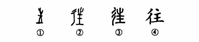 “寒來(lái)暑往,秋收冬藏?!边@個(gè)“往”字本為形聲字。①是甲骨文的形體,上部是一只腳趾朝上的腳,下部的“王(斧頭形)”字表讀音??梢?jiàn)“往”字本為上形下聲的形聲字。②是金文的形體,左又增加了意符“彳”,表示行動(dòng)。③是小篆的形體。④為楷書(shū)的寫(xiě)法。