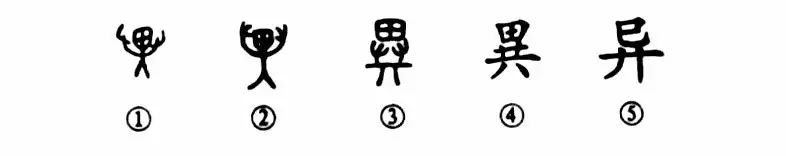 “獨在異鄉為異客,每逢佳節倍思親。”這里的“異”字本為象形字。甲骨文①就像正面站立的一個(gè)人,雙手上舉而護住頭部。②是金文的形體,更像人護頭之狀。③是小篆的寫(xiě)法,已發(fā)生了訛變。④為楷書(shū)繁體字。⑤為簡(jiǎn)化字。