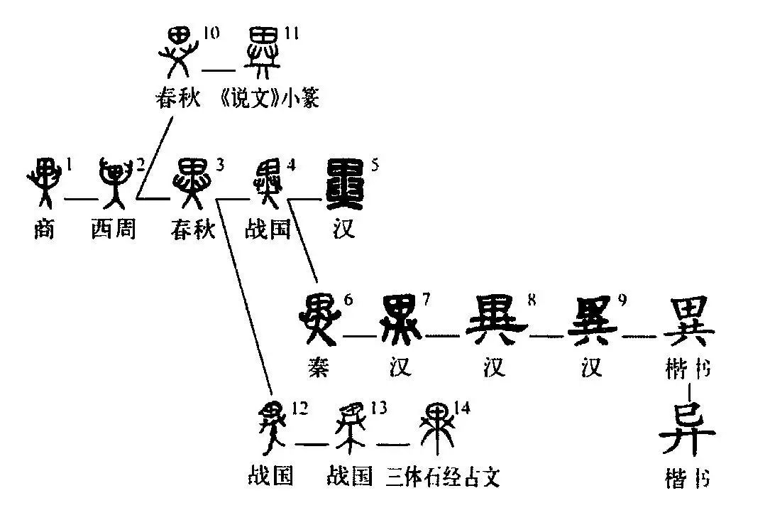 象形字。《說(shuō)文》:“異,分也。從廾,從畀。畀,予也。”“異”本像手持一物往頭上戴的形狀。前人早已指出,“異”是“戴”字的初文?!爱悺迸c“戴”本為一字,后來(lái)分化,義各有當,成為形、音、義各不相同的兩個(gè)字。許慎據訛變的字形說(shuō)解文字,不可能弄清“異”的本義及其與“戴”的關(guān)系?!爱悺钡淖中巫陨檀坠俏闹钡綕h代印文,一脈相承。雖然戰國文字異形很多、變化多端,但都沒(méi)有《說(shuō)文》小篆訛變得離譜?,F在所見(jiàn)的秦漢文字都比《說(shuō)文》小篆近古,因此,我們懷疑許慎為了牽合其“從廾,從畀”的說(shuō)法而謬改文字?!爱悺弊值暮?jiǎn)化字“異”見(jiàn)于《說(shuō)文》卷三“廾”部:“異,舉也。從廾,?聲?!队輹?shū)》曰‘岳曰異哉?!?/span>” “異”與“異”語(yǔ)音相近,“異”字未見(jiàn)古文字形體,文獻中用其本義的時(shí)候也極少,簡(jiǎn)化字以“異”代 “異”。(李守奎)