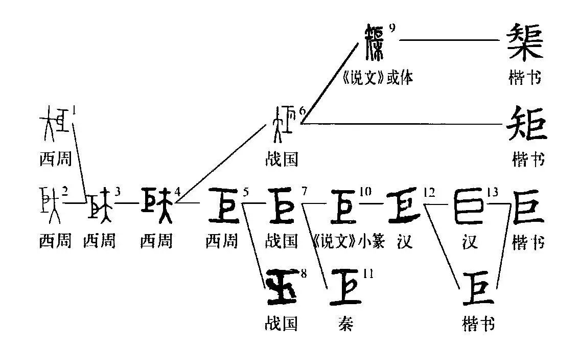 ”形徹底與人臂遠離。以后,“夫”形又訛作“矢”形,這就演變出了“矩”字。并由此產(chǎn)生了一個(gè)加“木”旁表義的異體字“榘”(參見(jiàn)“榘”字條)。戰國年間,“巨”字還出現過(guò)“