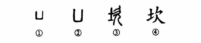 這是“坎坷不平”的“坎”字,本為象形字。甲骨文①就像坑坎的形狀。②是小篆的形體,與甲骨文相似。③也是小篆的形體,變成左形右聲的形聲字。④為楷書(shū)。