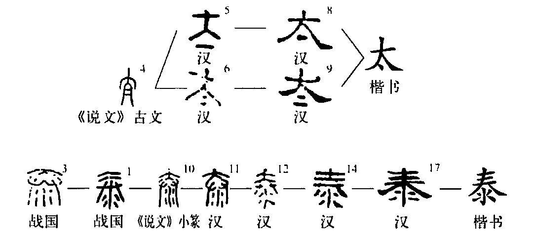,像正面站立之人形。中從“二”或表示身體部位(或以為區別筆畫(huà)以別于“大”),猶如甲骨文、金文之“文”字或加飾畫(huà)以表示文身交錯之形?!墩f(shuō)文》古文形體為后世“太”字所本。按:商、周無(wú)“太”字,每以“大”為之。典籍亦每以“大”為之?!按蟆?、“太”,古今字也,乃一字之分化。至戰國陶文而有“泰”字,是小篆形體所由出。漢后,漸合“??”為“大”狀,復與上部相連,遂成“??”形,為楷書(shū)所本。于是變小篆“泰”字由從大、從廾、從水三部結構為從??、從水之兩部結構字。《說(shuō)文》:“泰,滑也。”按:諸家或由此以尋造字之義?;蛑^古文“夳”下“二”形當作“仌(冰)”以取滑義;或謂“泰”為雙手(即廾)捧水,示水從手(指)中溜下以表滑義。然則是以會(huì )意釋之。清邵瑛《群經(jīng)正字》謂“今經(jīng)典無(wú)此義”,是釋字可,于義則無(wú)徵。姑闕之?;蜥尅疤敝x,以為古文“夳”乃“太之上者,從大、從古文上(即二)會(huì )意”,似亦勉強。茲以古文“夳”為象形,以“泰”為形聲,俟考。《廣韻·泰韻》:“泰,大也。”段玉裁《說(shuō)文解字注》“泰”下言:“后世凡言大而以為形容未盡則作太。如‘大宰’俗作‘太宰’,‘大子’俗作‘太子’,‘周大王’俗作‘太王’是也。謂‘太’即《說(shuō)文》‘夳’字,‘夳’即‘泰’,則又用‘泰’為‘太’。”按:大、太、泰三字之關(guān)系,何琳儀《戰國古文字典》“太”下說(shuō)解至為簡(jiǎn)賅。其言曰:“典籍之中,大、太、泰三字往往通用。大為象形,太為分化,泰為假借。”《書(shū)·泰誓上》孔穎達疏:“顧氏以為,泰者,大之極也,猶如天子諸侯之子曰太子,天子之卿曰太宰。此會(huì )中之大,故稱(chēng)‘泰誓’也。”“泰誓”即“太誓”,極言其盛。《禮記·曲禮》:“假爾泰龜有常,假爾泰筮有常。”孔穎達疏:“泰,大中之大也。”上所列“泰”字多用為大、太義,例多不備舉。要之,大、太一字而分化;太、泰成兩條脈絡(luò )歧而為二,始每通用,后分而為三。(王逸鶴)