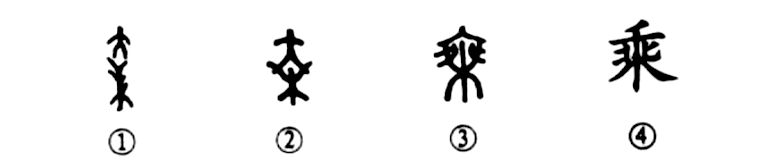 這是“乘肥馬,衣輕裘”的“乘”字,是個(gè)會(huì )意字。甲骨文①的下部是一棵樹(shù),樹(shù)頂上站著(zhù)一個(gè)人,表示乘于其上。金文②也是這個(gè)意思,其下是“木”(樹(shù))形,其上是“人”形。小篆③下部的“木”形猶在,但其上的“人”形則不太像了,不過(guò)人的左右兩只腳倒是很像攀援樹(shù)枝之形。④是楷書(shū)的形體,中間的“北”字之形是由小篆中人腳之形變來(lái)的。
