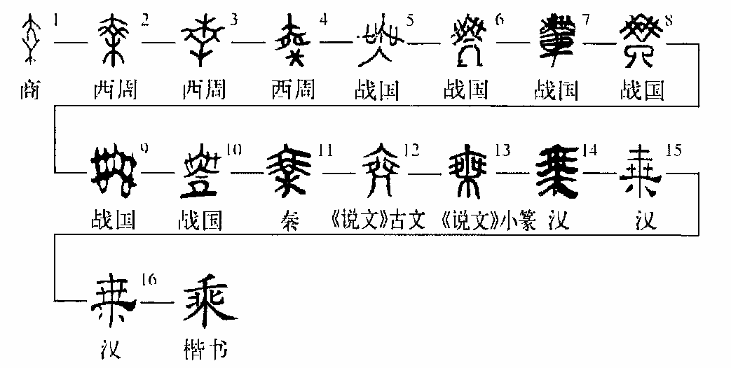 從木。戰國文字訛變更甚,除秦文字從木外,大多已不從木,而改從幾;且多將原標在 “大”下端的兩“止”,與“大”的像人兩臂處直接相連。楚文字有從車(chē)者,即《集韻》的??字,是為“乘”的分化字,字義不變。漢代文字沿襲秦代字形,而向便于書(shū)寫(xiě)方向發(fā)展。乘是人爬到樹(shù)上,故有升義。《詩(shī)·豳風(fēng)·七月》:“亟其乘屋”,毛傳:“乘,升也。”金文言“乘舟”,如“庚率二百乘舟入