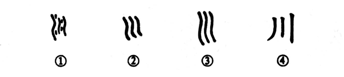 這是“百川灌河”的“川”字。甲骨文①彎彎曲曲的形狀像一條河流,曲線(xiàn)中的四個(gè)點(diǎn)兒是指河流中的漩渦。所以“川”字是個(gè)象形字,它的本義就當河流講。金文②則把水中的“點(diǎn)兒”去掉了,這是為了書(shū)寫(xiě)方便。③是小篆形體,同于金文。④是楷書(shū)的形體。