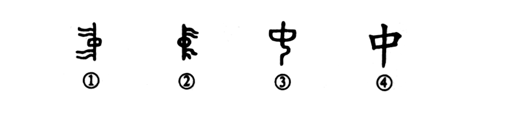 這是“卉中自生香”的“中”字,是個(gè)象形字。甲骨文①是直立的一面旗幟,向左彎曲的四條線(xiàn)是“旗游”(旗幟上的飄帶),而中間的“口”形就表示“中間”之意。②是金文的形體,“旗游”飄向右邊。③是小篆的形體,把“旗游”全省略了,中間旗桿呈彎曲形,這是一種書(shū)寫(xiě)上的美化。④是楷書(shū)的寫(xiě)法。