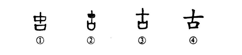 這個(gè)“古”字是個(gè)會(huì )意字。甲骨文①的上部可不是“中華”的“中”字,而是“十”字,表示“多”義;其下部是個(gè)“口”字。這是說(shuō),世世代代口口相傳就叫“古”。金文②的上部仍然是“十”字,下部是“口”字。小篆③和楷書(shū)④也基本上同于甲金文字。