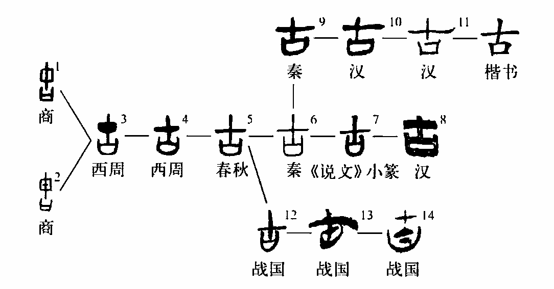 ”是同一道理。自西周中晚期盾形線(xiàn)條化成“十”之后,形體基本穩固,戰國文字中雖然有“口”中加點(diǎn)、線(xiàn)的異體,但在以小篆統一的文字和秦漢古隸的演變中都逐漸消失了。許慎所說(shuō)的“從十、口,識前言者也”是據后代的字形說(shuō)后代的字義。如果只就小篆等后起字形和“古”的常用義“時(shí)間久遠”而言,是合理的,經(jīng)過(guò)十人之口傳下來(lái)的故事,正是時(shí)間久遠。許慎未能言中“古”的本形本義,是受所見(jiàn)材料的限制,我們不能苛求古人。(李守奎)