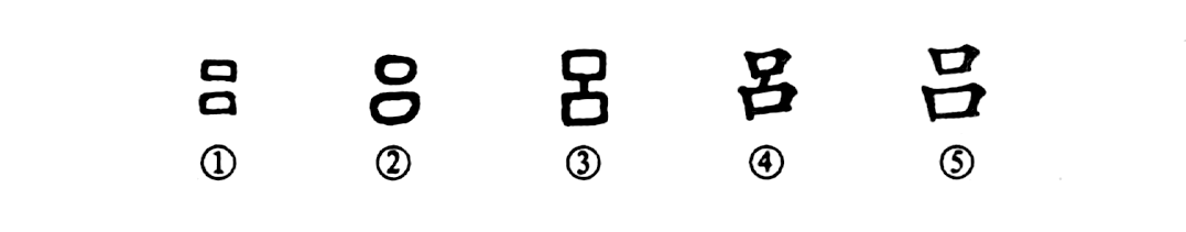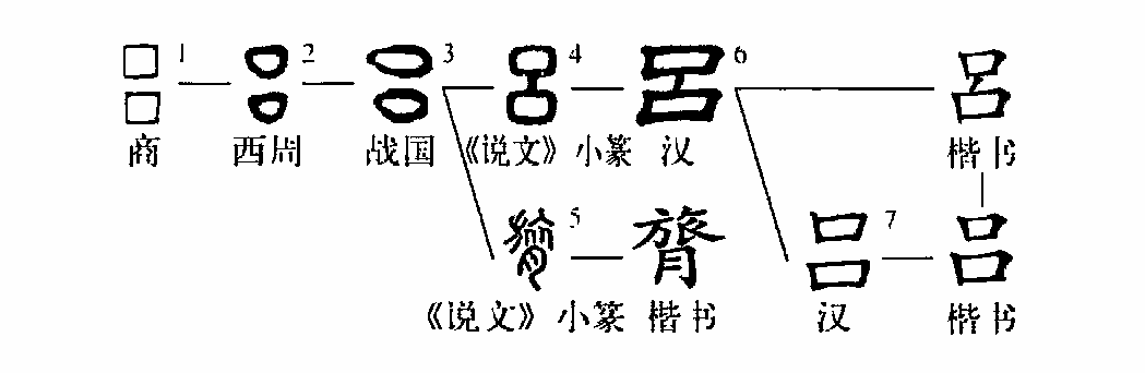 這個(gè)“呂”字也是個(gè)象形字。你看甲骨文①是兩個(gè)方“口”,表示人(或動(dòng)物)的脊骨,一塊接一塊地連成一串。金文②則變成了圓形,當然也還像脊骨的樣子。小篆③為了使脊骨之間緊密相連,所以中間又加了一條連接線(xiàn)。④為楷書(shū)的寫(xiě)法,是直接由小篆演變而來(lái)。后來(lái)為了書(shū)寫(xiě)方便,則把楷書(shū)中間的那一豎筆省掉了,這就成為現行的楷書(shū)⑤的形體了。