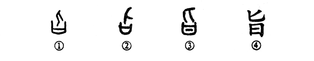 “彼有旨酒,又有嘉肴。”這個(gè)“旨”字是個(gè)會(huì )意兼形聲的字。甲骨文①的上部是“匕”,也就是“匙(湯匙)”的形狀,下部是“口”,盛湯入口便覺(jué)味美,這是會(huì )意。同時(shí),“旨”也是“從口,從匕得聲”的字,故為形聲。②是金文的形體,與甲骨文基本相同。③是小篆的寫(xiě)法,將原形的“口”變?yōu)椤案省?,“甘”為“甜”義,所以“味美”的意思更為明顯。④為楷書(shū)的寫(xiě)法。