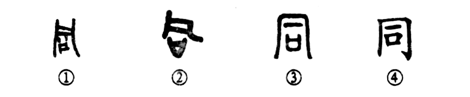 這是“普天同慶”的“同”字。甲骨文①的上部是覆盤(pán)之形,表示“會(huì )聚”義:下部是“口”,以一口代眾口,會(huì )聚眾口即為同,所以“同”字是個(gè)會(huì )意字。②是金文的形體,與甲骨文基本相同。③是小篆的寫(xiě)法。④為楷書(shū)形體。