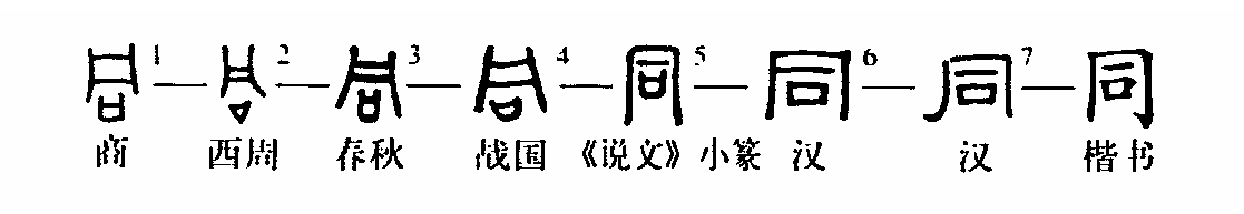會(huì )意字。由一種四人抬東西的用具的象形和“口”組成,表示四人用口令協(xié)調行動(dòng)(參見(jiàn)“興”字條)。后來(lái),“同”字上部像抬東西用具的部分逐漸變形,并把下部的“口”包在里邊,到了秦代篆文中,原來(lái)不相連的三個(gè)筆畫(huà)被連接起來(lái),形成一條長(cháng)的曲線(xiàn)。到了漢代隸書(shū)中這一長(cháng)的曲線(xiàn)又被分成兩筆,以便于書(shū)寫(xiě),楷書(shū)“同”字是由這種寫(xiě)法演變而成。本義是共同做事。《書(shū)·立政》:“惟羞刑暴德之人,同于厥邦。”孔穎達疏:“惟進(jìn)用刑罰與暴德之人同治其國。”(張玉金)