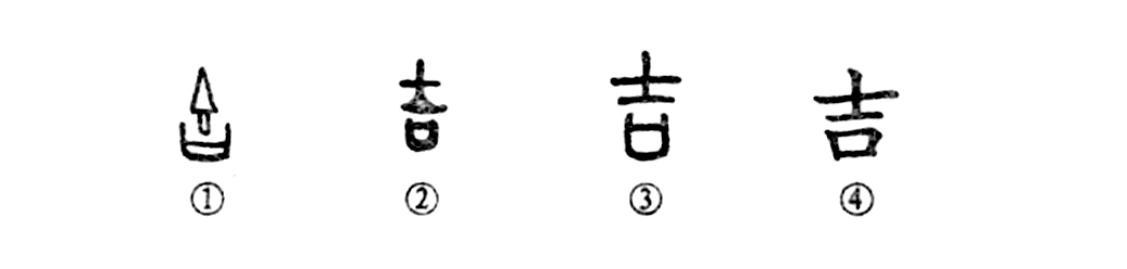 這是“吉祥如意”的“吉”字,本為會(huì )意字。①是甲骨文的形體,上部是一銳利的兵器之形,下部是裝置兵器的器物,本有“寶愛(ài)”之義,所以也就可以引申為“吉利”。②是金文的寫(xiě)法,其上變?yōu)楦^(兵器)之形。③是小篆的形體,其上訛變?yōu)椤笆俊?。④為措?shū)的形體。