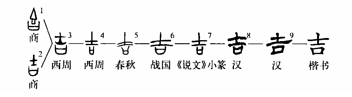 會(huì )意字。從士,從口。甲骨文中“吉”字較原始的寫(xiě)法作