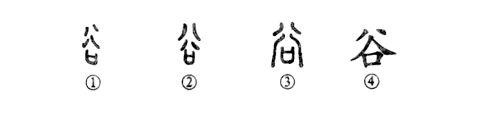 這是“山鳴谷應”的“谷”字,原為會(huì )意字。①是甲骨文的形體,上部是水形,下部是水的出口處,表示泉水從泉眼流出。②是金文的形體,與甲骨文相同。③是小篆的形體。④為楷書(shū)的寫(xiě)法。