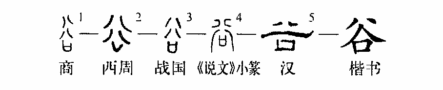 會(huì )意字。甲骨文字形下面像谷口,上面像水流出。甲骨文上邊是兩個(gè)八字,下邊是口形。金文與甲骨文略同。小篆字形規整勻稱(chēng),下面八字變形。隸書(shū)、楷書(shū)筆畫(huà)化,近于金文。本義是兩山之間的水流。《淮南子·說(shuō)山》:“江河所以長(cháng)百谷者,能下之也。”從本義引申指兩山中間的低洼地,如山鳴谷應。從兩山間的低洼地引申比喻困難。《詩(shī)·大雅·桑柔》:“進(jìn)退維谷。”谷假借為“穀”?!胺Y”本是莊稼和糧食的總稱(chēng)。漢陸賈《新語(yǔ)·慎微》:“棄二親,捐骨肉,絕五谷,廢《詩(shī)》、《書(shū)》,背天地之寶,求不死之道。”(馮華)