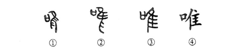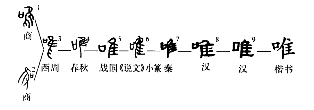 這個(gè)“唯”字,本為會(huì )意兼形聲的字。①是甲骨文的形體,右邊像一只鳥(niǎo)形,左邊為一“口”,原表示鳥(niǎo)鳴之聲。②是金文的形體。③是小篆的形體。④是楷書(shū)的形體。從形體上看,一脈相承。