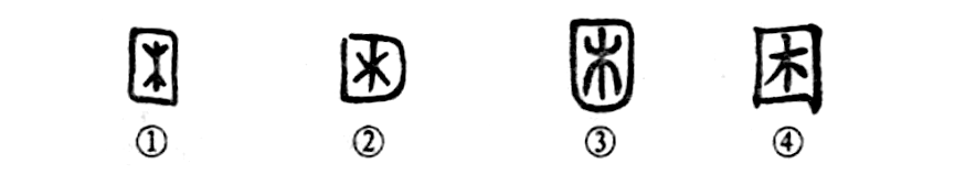 這是“困知勉行”的“困”字,原為會(huì )意字。①是甲骨文。外邊的方框像門(mén)的四旁,中間的“木”為門(mén)撅?!袄А笔恰皸y”的古文。②是戰國竹簡(jiǎn)文的形體。③是小篆的形體,與甲骨文相同。④是楷書(shū)的寫(xiě)法。