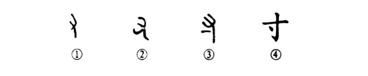 “相思不可寄,直在寸心中?!边@個(gè)“寸心”的“寸”字,比喻區區之心。其實(shí)“寸”字在甲骨文和金文中作偏旁用時(shí),與“又”(手)字并沒(méi)有什么區別。你看甲骨文①和金文②的形體就是“手”(又)形。③是小篆的形體,在手下之左側有一小橫,這是離手掌一寸的地方,就叫“寸口”(試脈處)。④是楷書(shū)的形體。