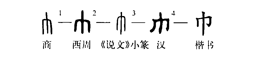 這個(gè)“巾”字是個(gè)象形字。甲骨文①就像掛下來(lái)的一幅布或一條手巾。金文②和小篆③也都基本上同于甲骨文。④是楷書(shū)的寫(xiě)法。