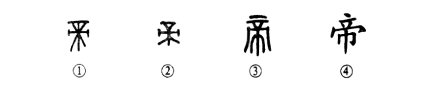 這個(gè)“帝王”的“帝”字是個(gè)象形字。甲骨文①像橫七豎八的一堆木柴,準備點(diǎn)燃。金文②基本上同于甲骨文。小篆③比甲骨文、金文更復雜,其下部變成了“巾”,所以姑且將“帝”字放在“巾”部。其實(shí)“帝”字與“巾”字在詞義上并無(wú)聯(lián)系,僅是“帝”字的部分形體似“巾”。④是楷書(shū)的寫(xiě)法。