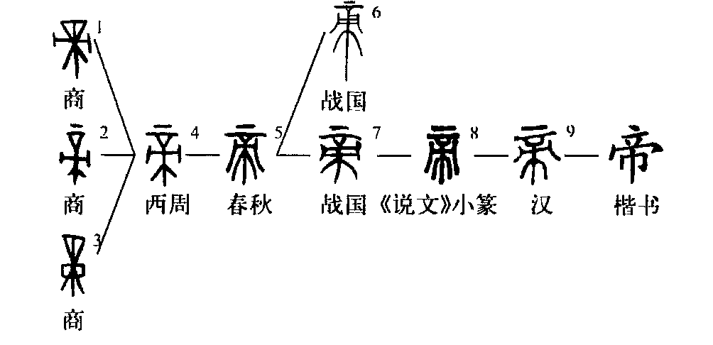 形字。構形不明。有學(xué)者認為本像花蒂之形,為“蒂”字初文?!墩f(shuō)文》則認為是從上束聲的形聲字。帝字在甲骨文中已出現,多指天帝。《小屯·殷墟文字乙編》6951:“至甲辰帝不其令雨。”(至甲辰這一天,天帝都不會(huì )令下雨)亦可指先王,像帝乙、帝辛、文武帝,都是對先王的尊稱(chēng),所謂德配彼天。人君生而稱(chēng)帝,當自晚周時(shí)開(kāi)始,《戰國策·趙策三》:“秦之所以急圍趙者,前與齊湣王爭強為帝。”帝字,甲骨文作“